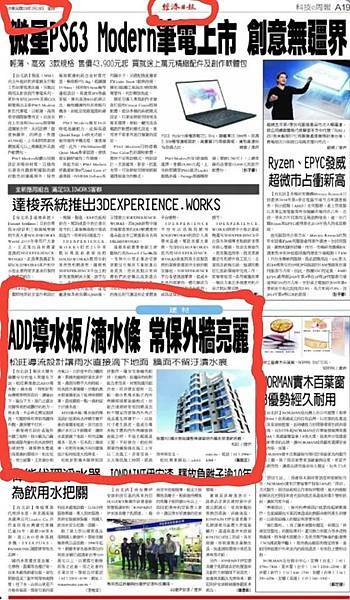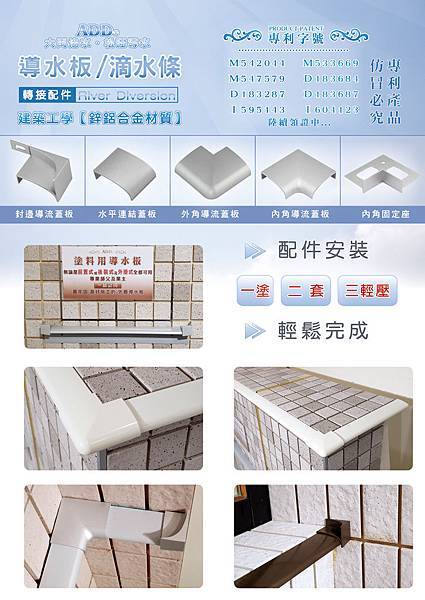 ADD滴水條/導水板的導流設計能使雨水沖積污塵不會沿著牆面延流,其用意在讓污水可以不經牆面,讓雨水直接滴下地面,利用這種導水、阻水、引水的工學原理,可將雨水無方向四竄殘留污垢的程度大為降低。